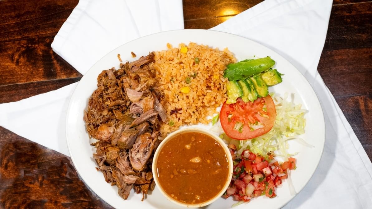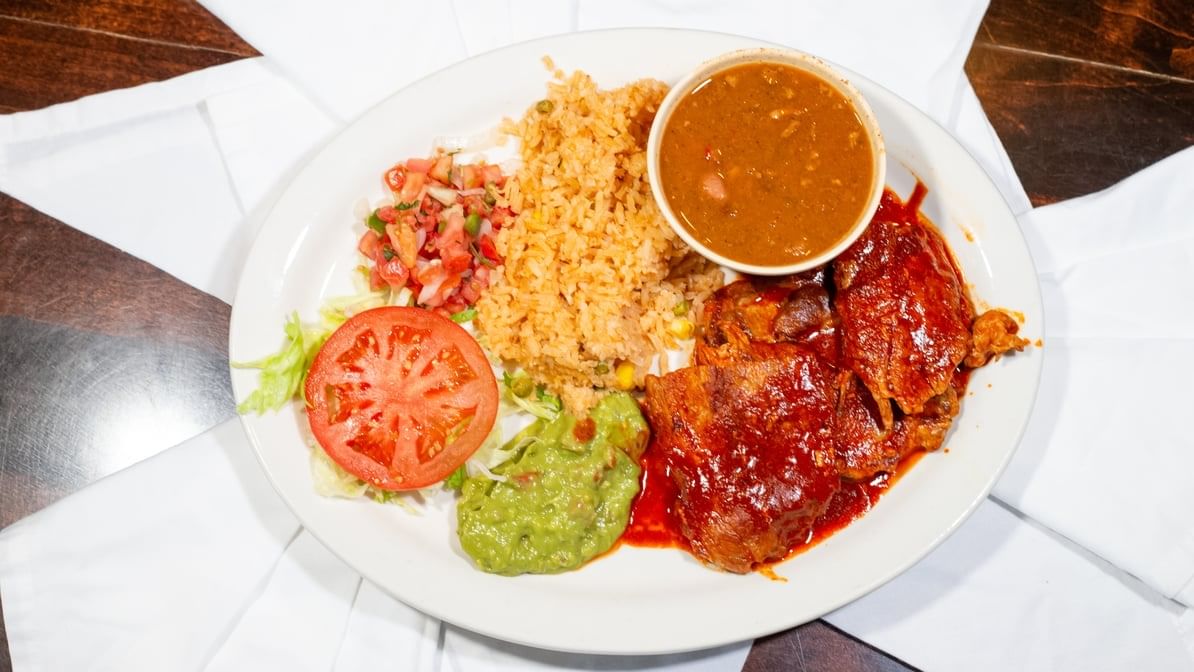 Small slices of pork marinated with our special red sauce. Served with charro beans, pico de gallo, guacamole, rice and tortillas