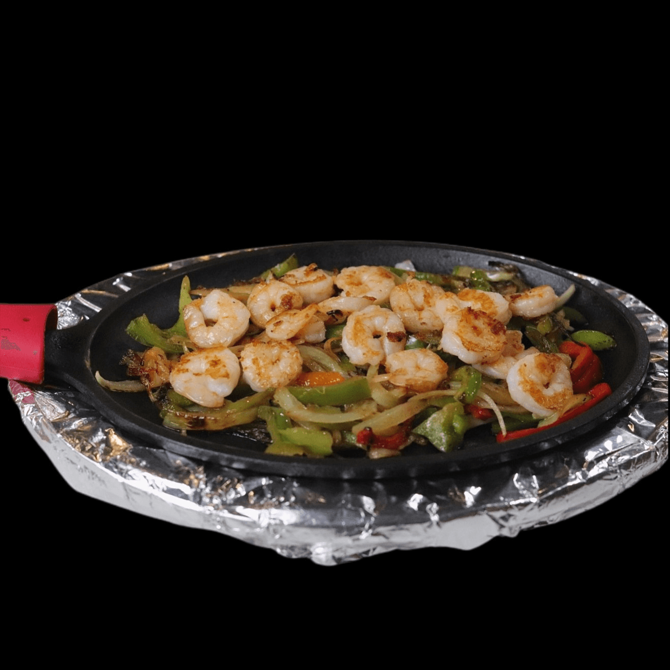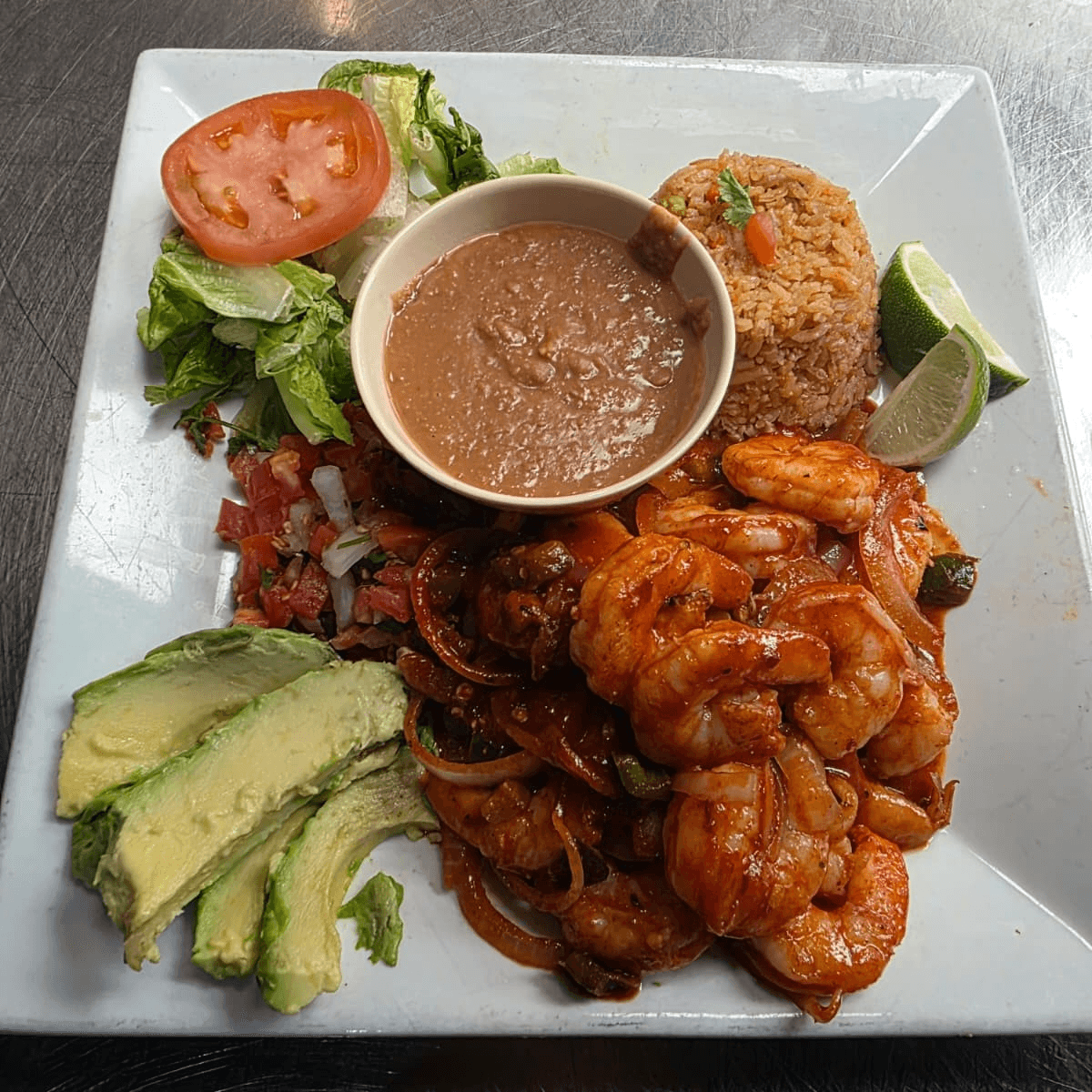 Shrimp cooked with a bed of peppers and onions. served with beans, rice, guacamole, sour cream and pico de gallo