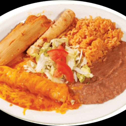 Combination plate featuring a crispy flauta, choice of cheese, chicken, or beef enchilada, savory tamale, served with Spanish rice and refried beans.