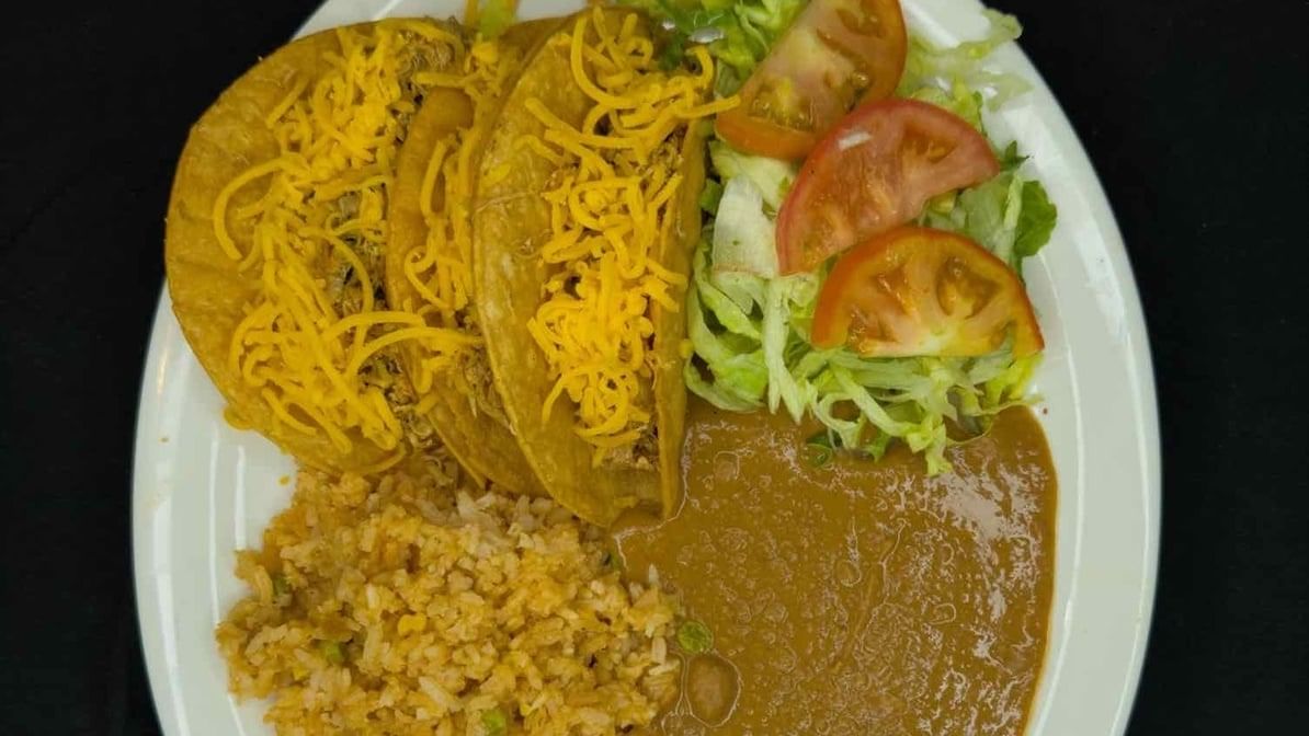 Three crispy beef tacos topped with shredded cheese, served with Spanish rice, refried beans, and a side salad with lettuce and tomatoes.
