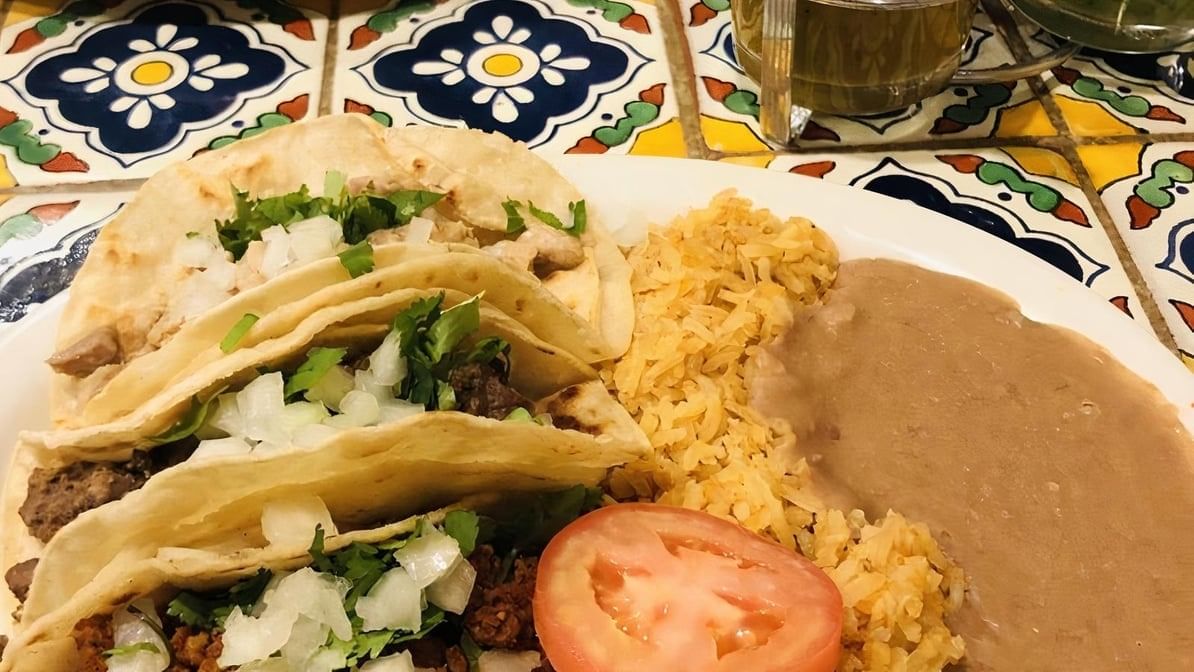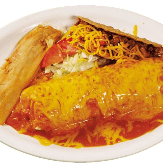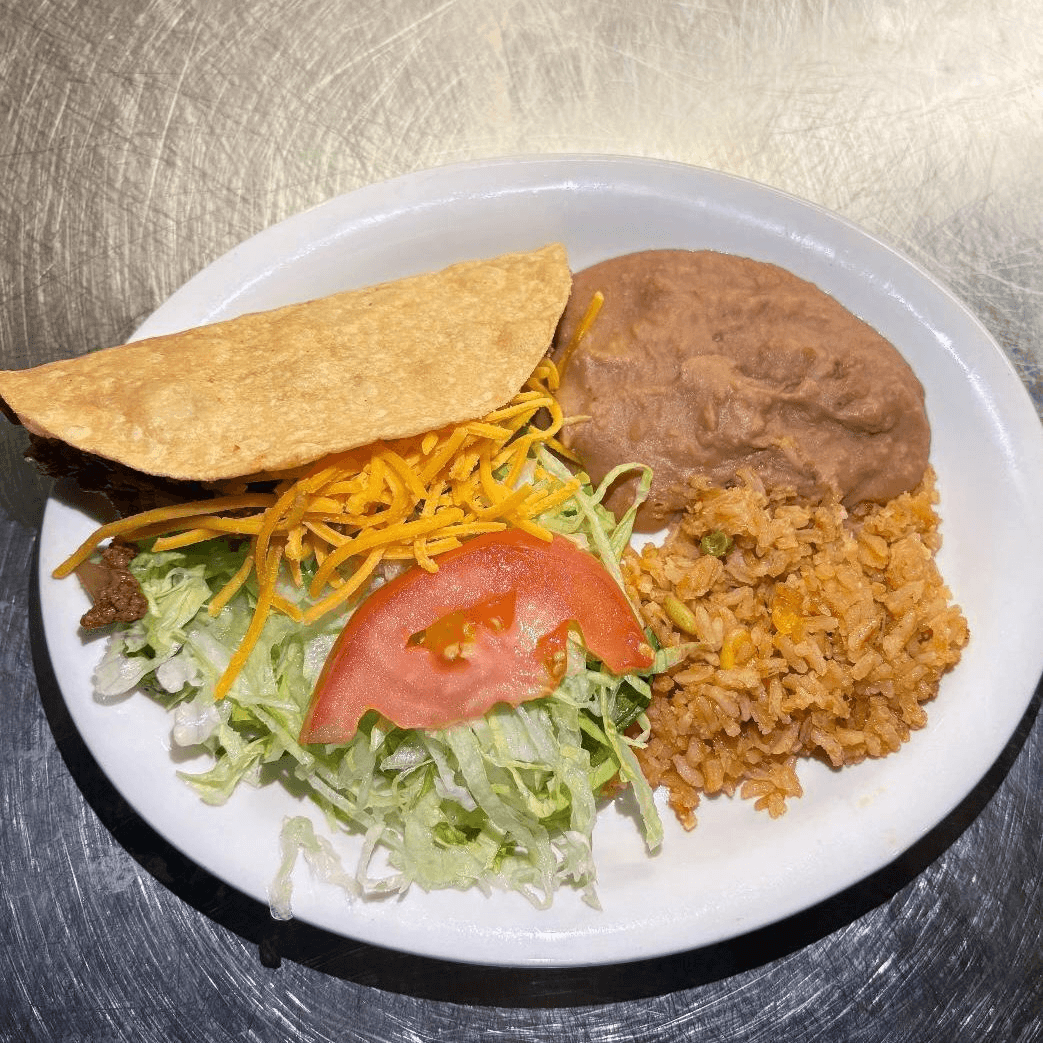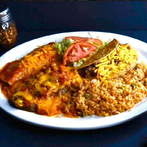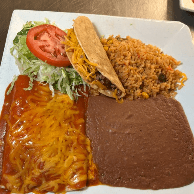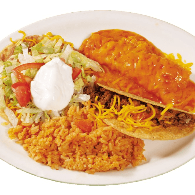 Crispy beef taco, choice of cheese, chicken, or beef enchiladas. Served with Spanish rice, refried beans.