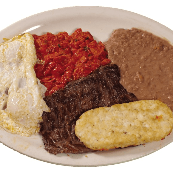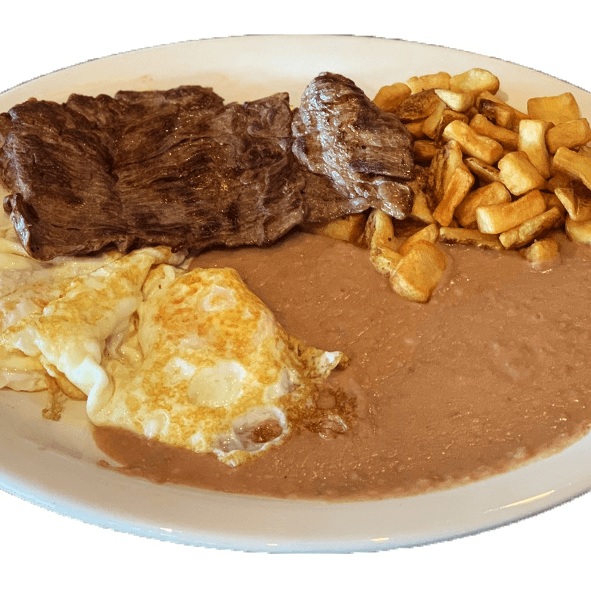 Two eggs and steak grilled to your liking. Served with potatoes, refried beans, and tortillas