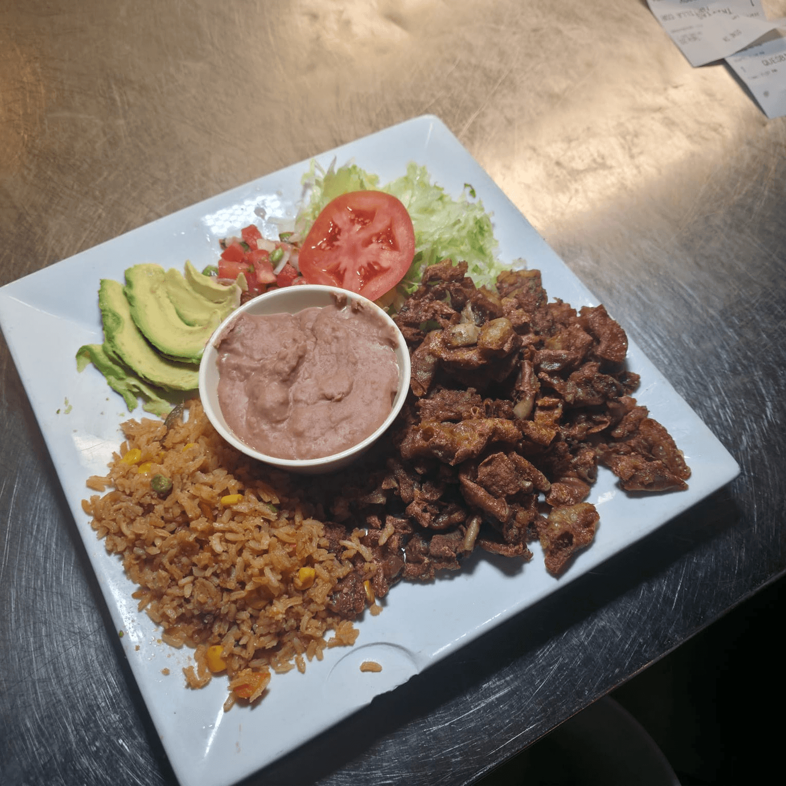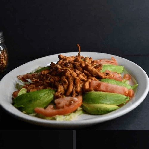 Small slices of pork served with Spanish rice, refried beans, salad, avocado, pico de gallo and tortillas