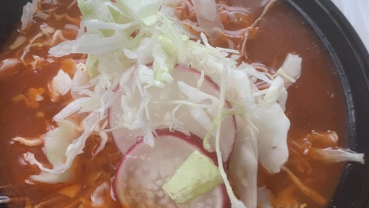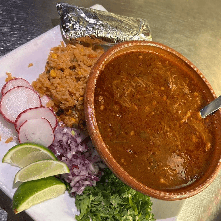 Small pieces of pork and hominy in a Mexican-style soup. Served on weekends only
