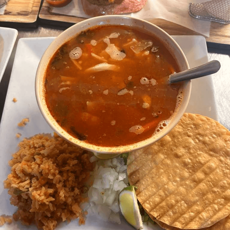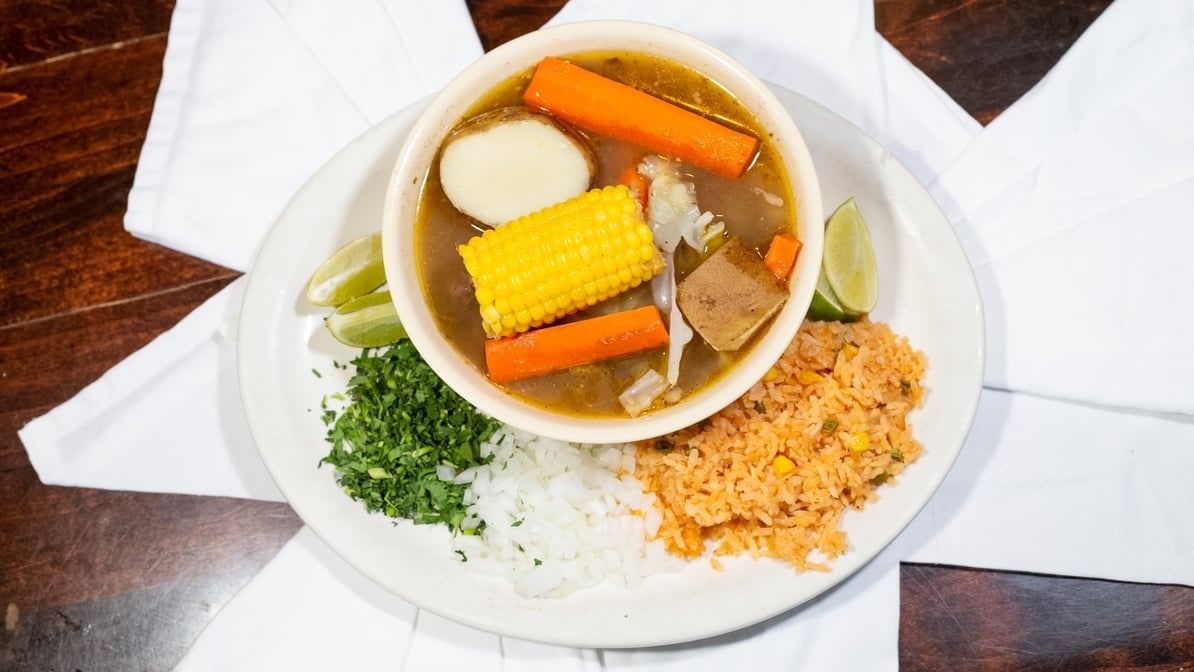 Beef soup served with Spanish rice and tortillas