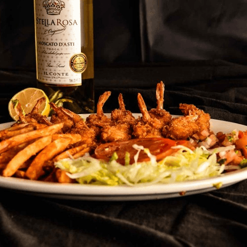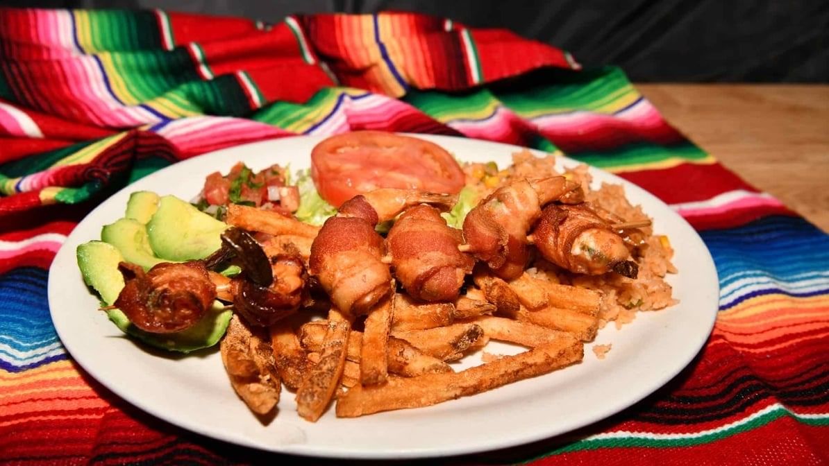 5 shrimp wrapped in bacon and filled with jalapeño and cream cheese. Served with salad, mexican rice, and french fries