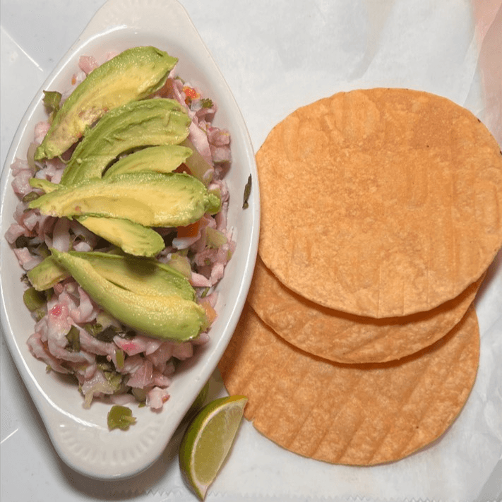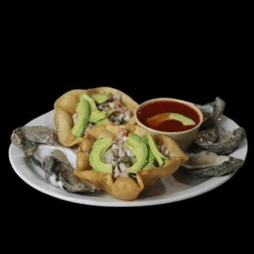 6 Oysters, 2 sides of ceviche on a fried flour tortilla topped with avocado and our special cocktail sauce