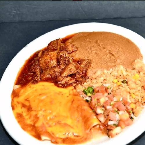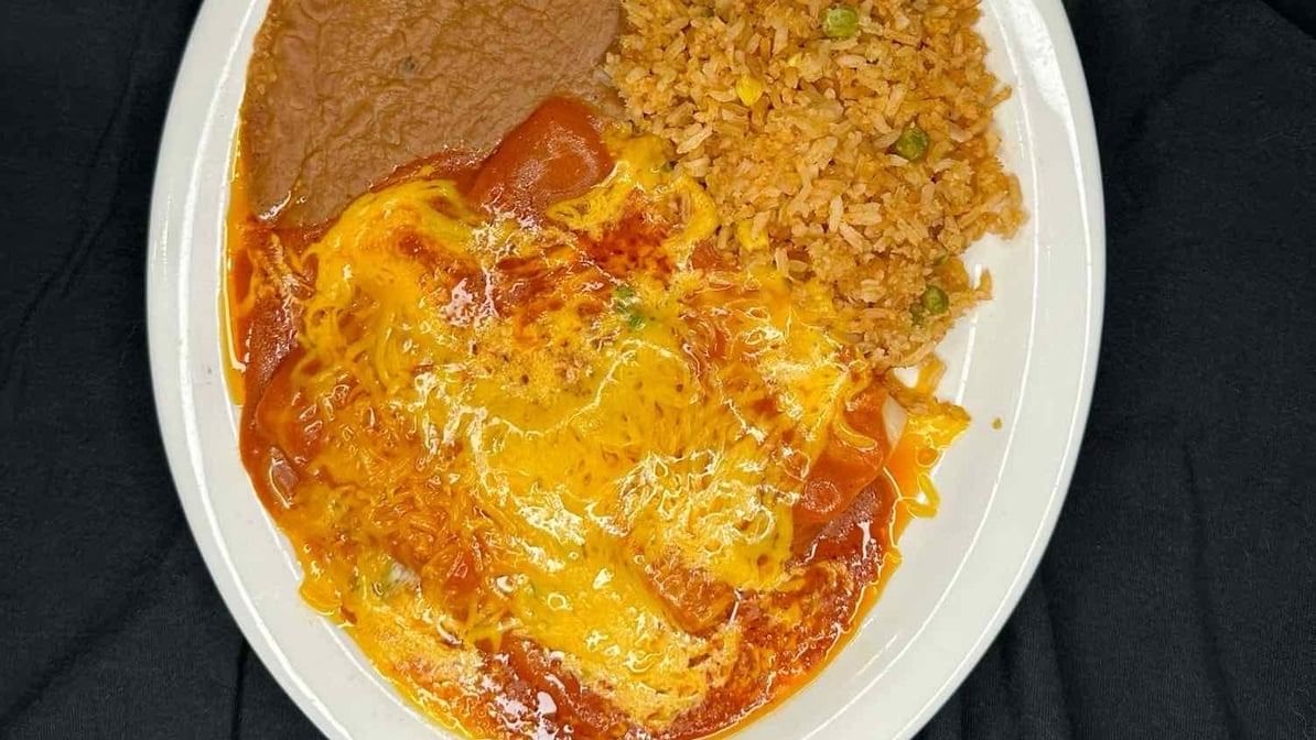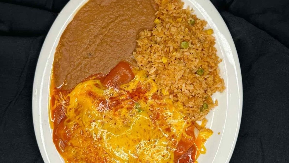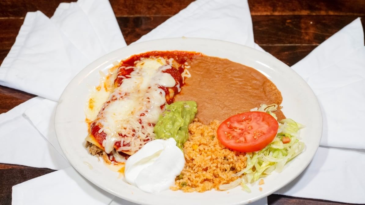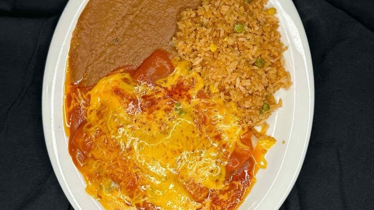 Two enchiladas filled with cheese, chicken, or beef, paired with asado, Spanish rice, refried beans, and fresh pico de gallo.
