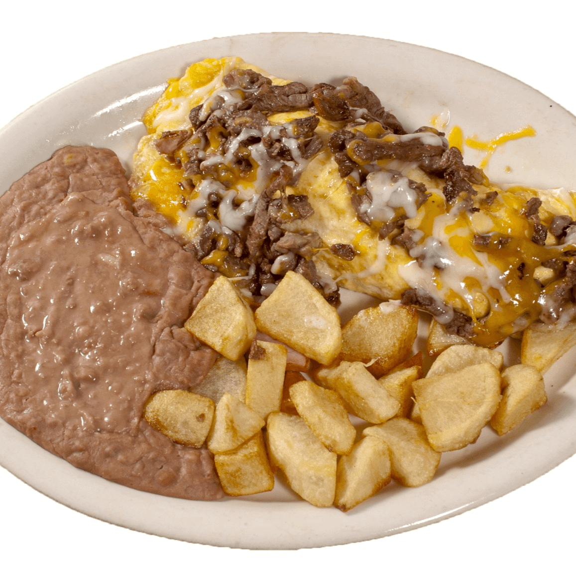 2 eggs scrambled, steak, cheese, refried beans, potatoes, and tortillas