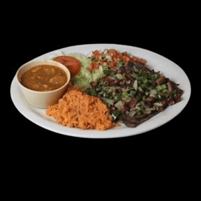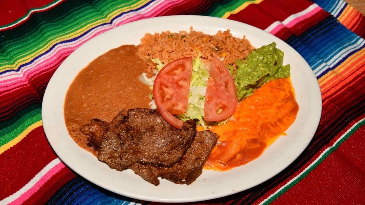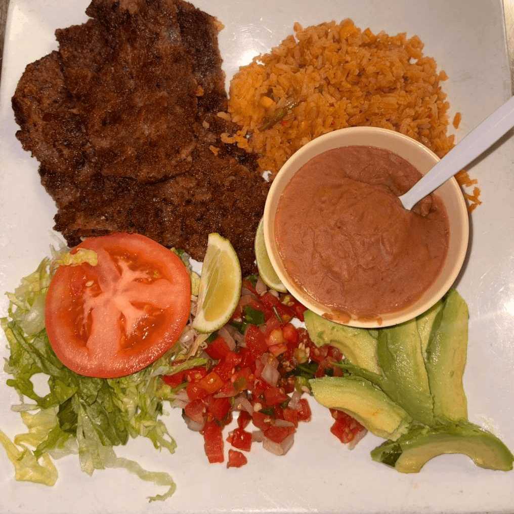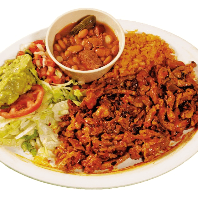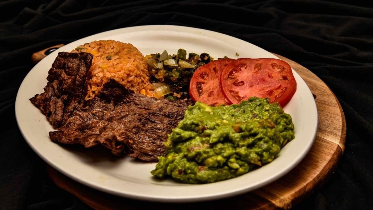 A thin, grilled fajita-style steak served with charro beans, pico de gallo, guacamole salad, rice and tortillas