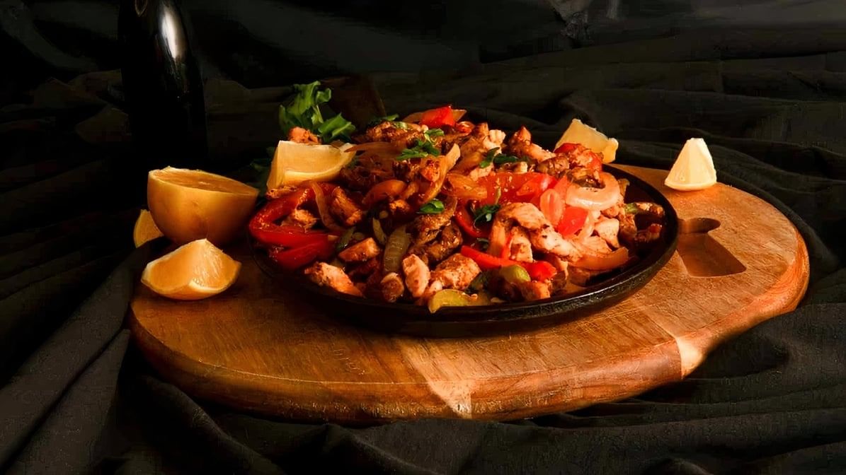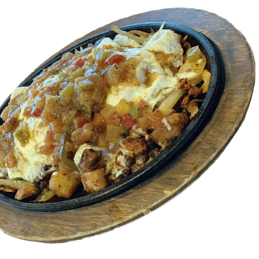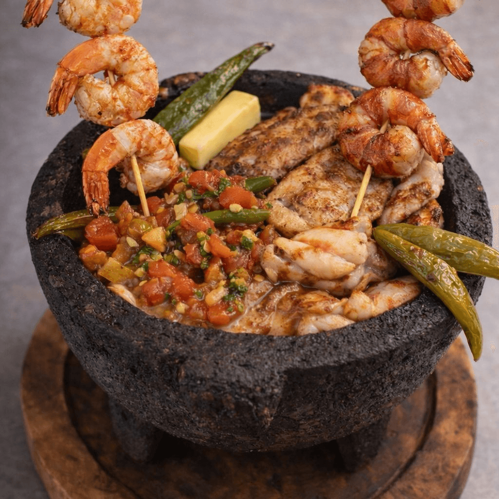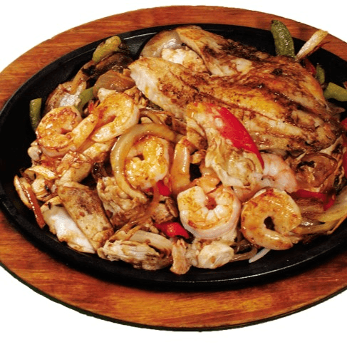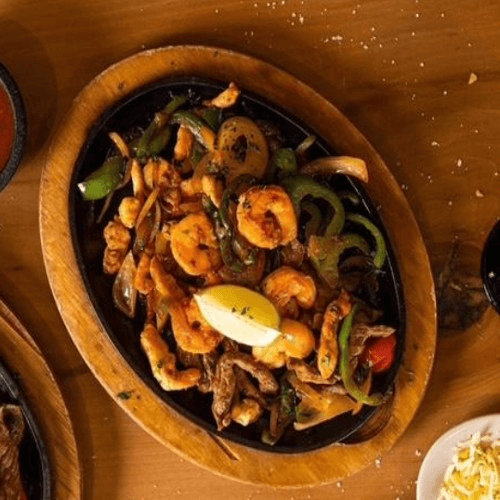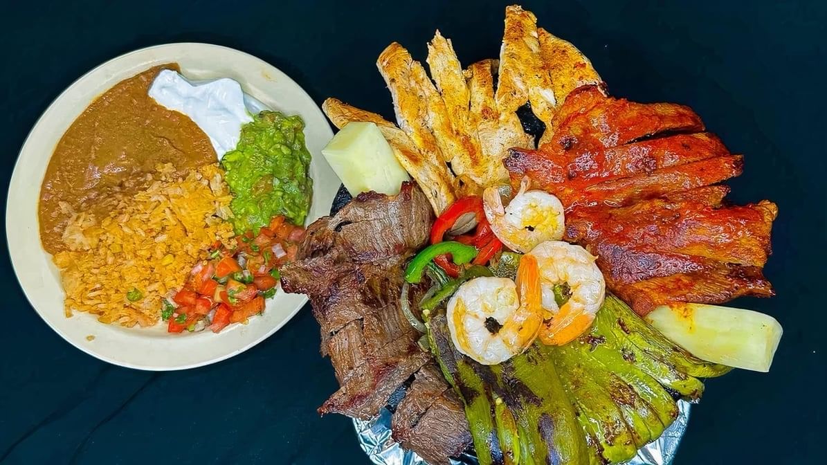 A hearty mix of grilled steak, chicken, shrimp, and chorizo, served with roasted cactus, bell peppers, and a side of rice, beans, guacamole, sour cream, and pico de gallo.