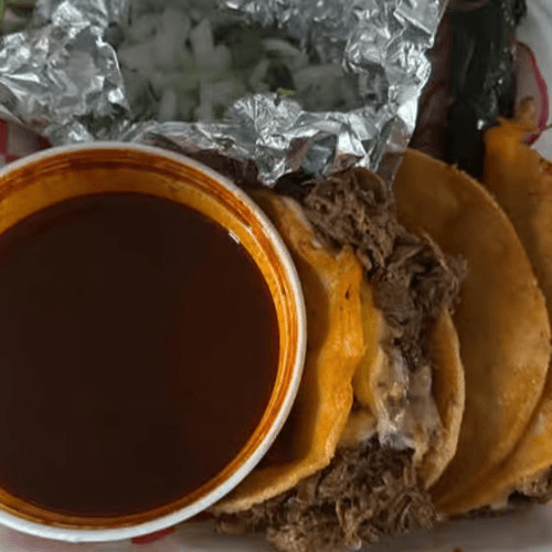 3 Quesataco in corn tortilla with delicious Birria. Comes with consome, cilantro and onions