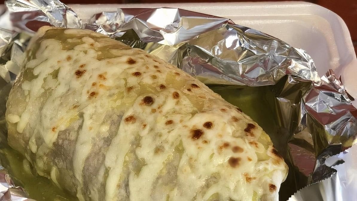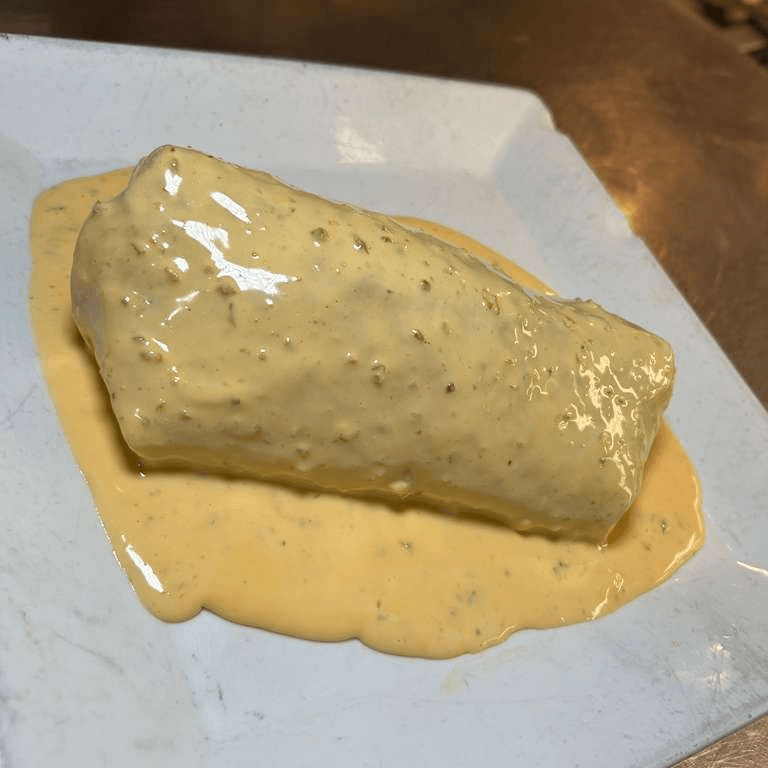 House burrito topped with our special queso sauce