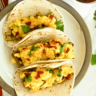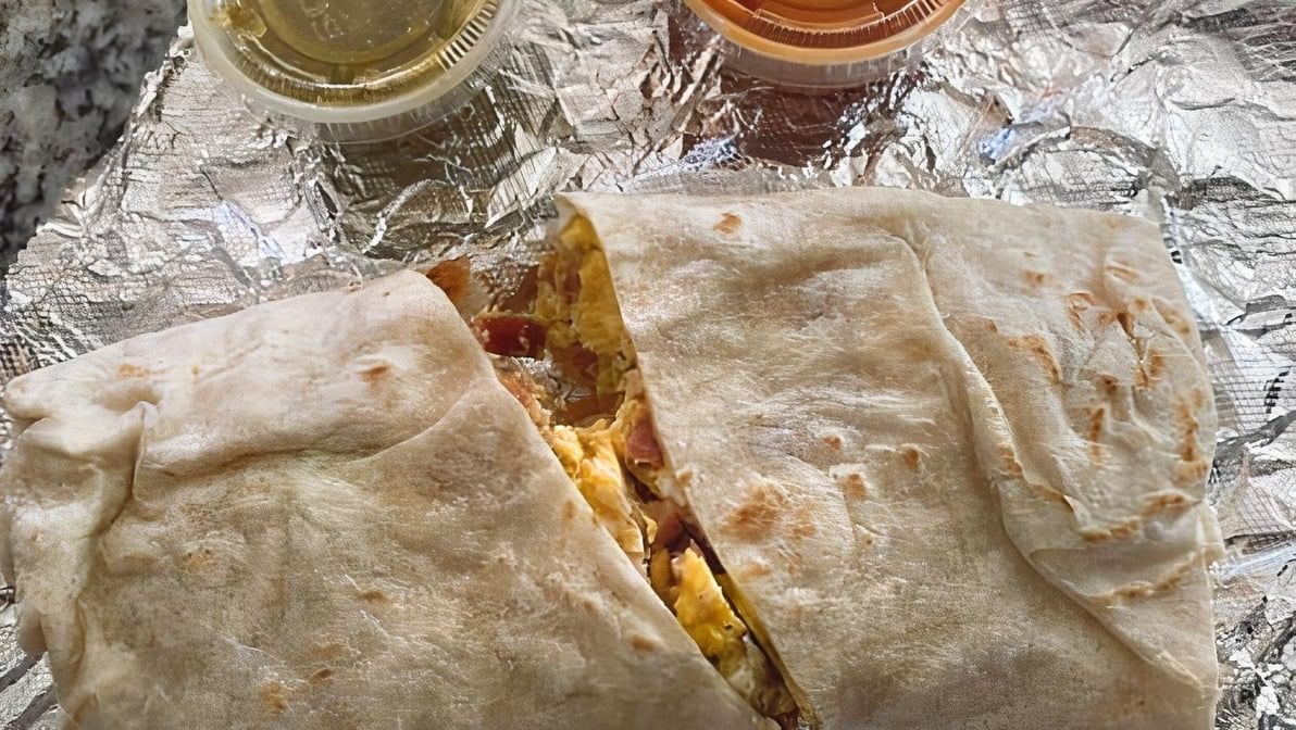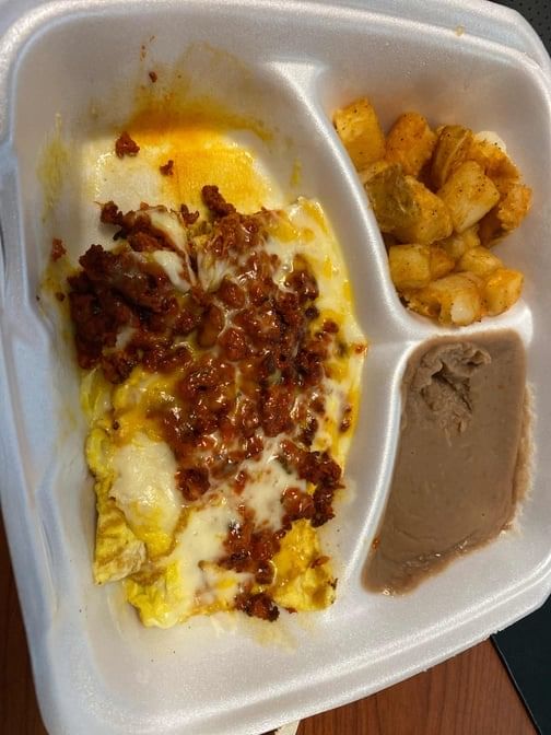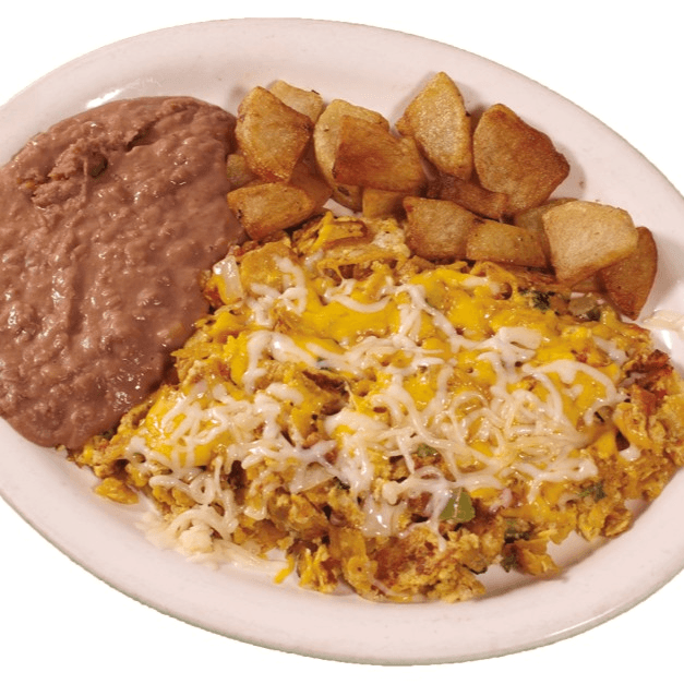 2 eggs scrambled, with your choice of ham, bacon, sausage, or chorizo, topped with cheese. Served with refried beans, potatoes, and tortillas