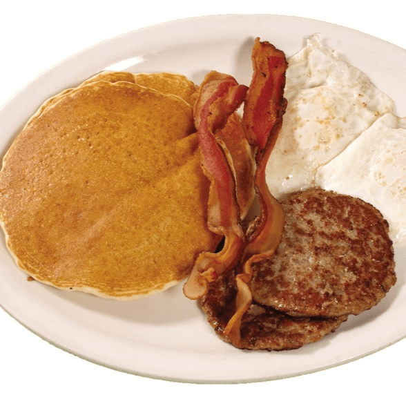 2 pancakes, 2 eggs, 2 bacon strips and 2 sausage patties