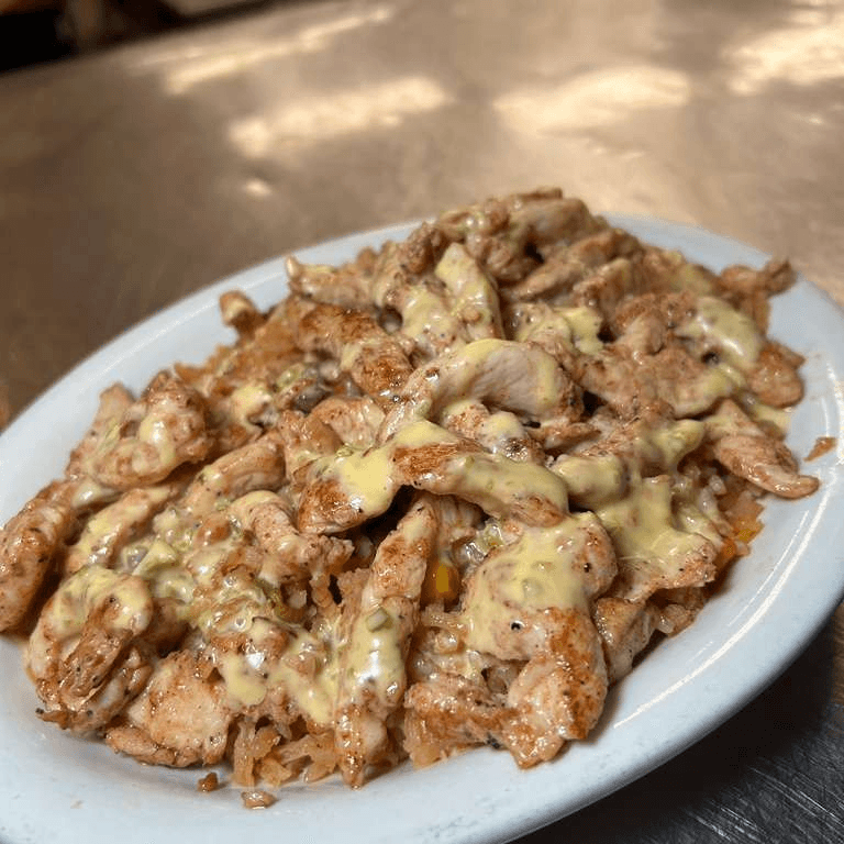 Chicken Fajita on top of a bed of riced covered in our special homemade queso dip