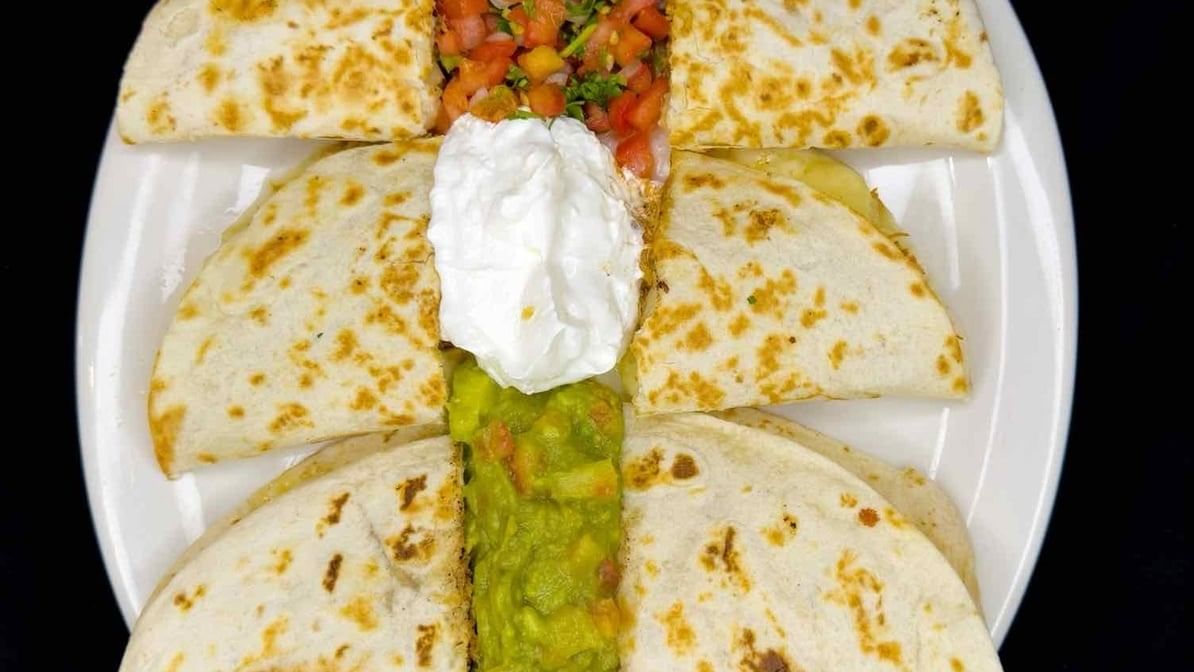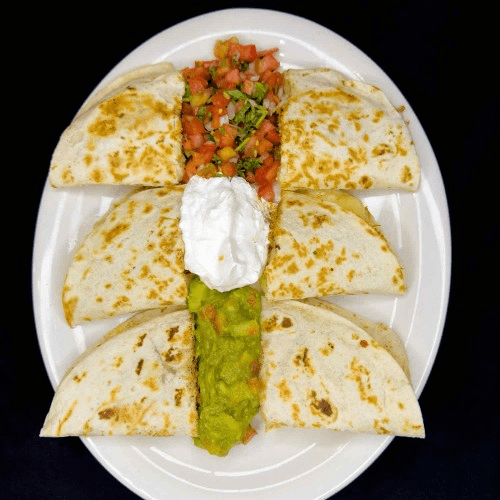 Three tortillas grilled and stuffed with melted cheese and meat. Served with pico de gallo, sour cream, and guacamole