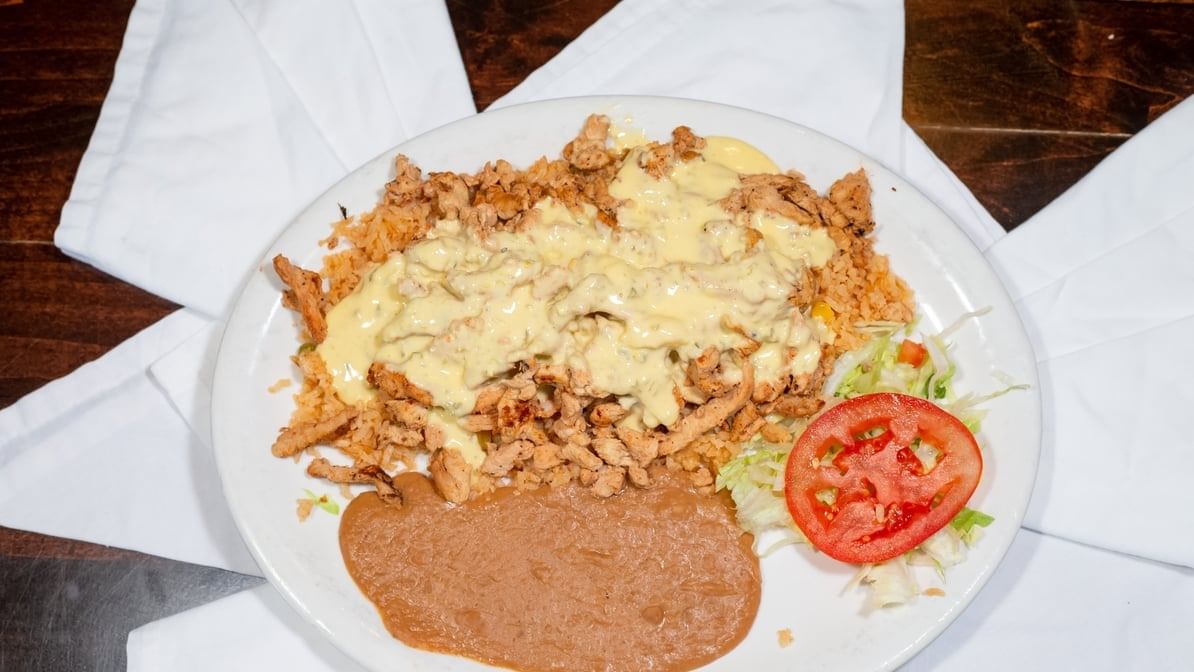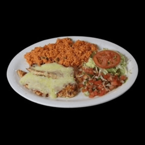2 thin chicken breasts topped with our special queso sauce. Comes with rice, salad, pico de gallo, and tortillas