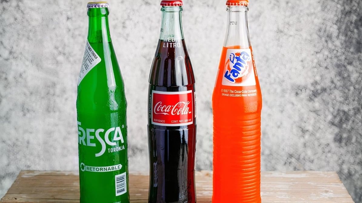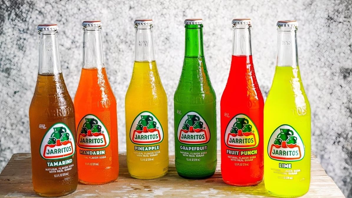 Variety of bottled Mexican beverages: Fresca, Grape Fanta, Mexican Coke, Orange Fanta, Topo Chico.