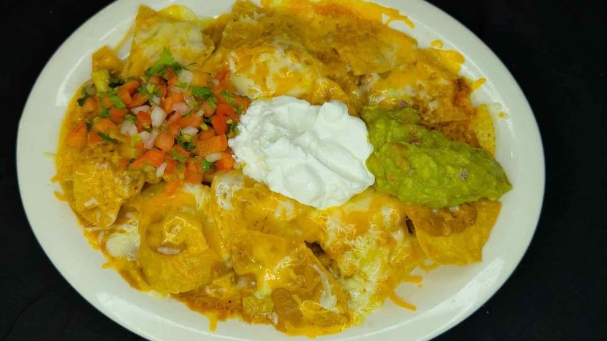 Crispy tortilla chips topped with melted cheese, refried beans, fresh pico de gallo, creamy guacamole, and a dollop of sour cream.