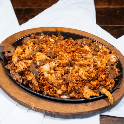 Beef and chicken fajitas, chorizo, pepper and onion topped of with white cheese