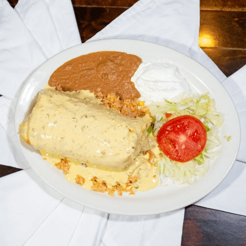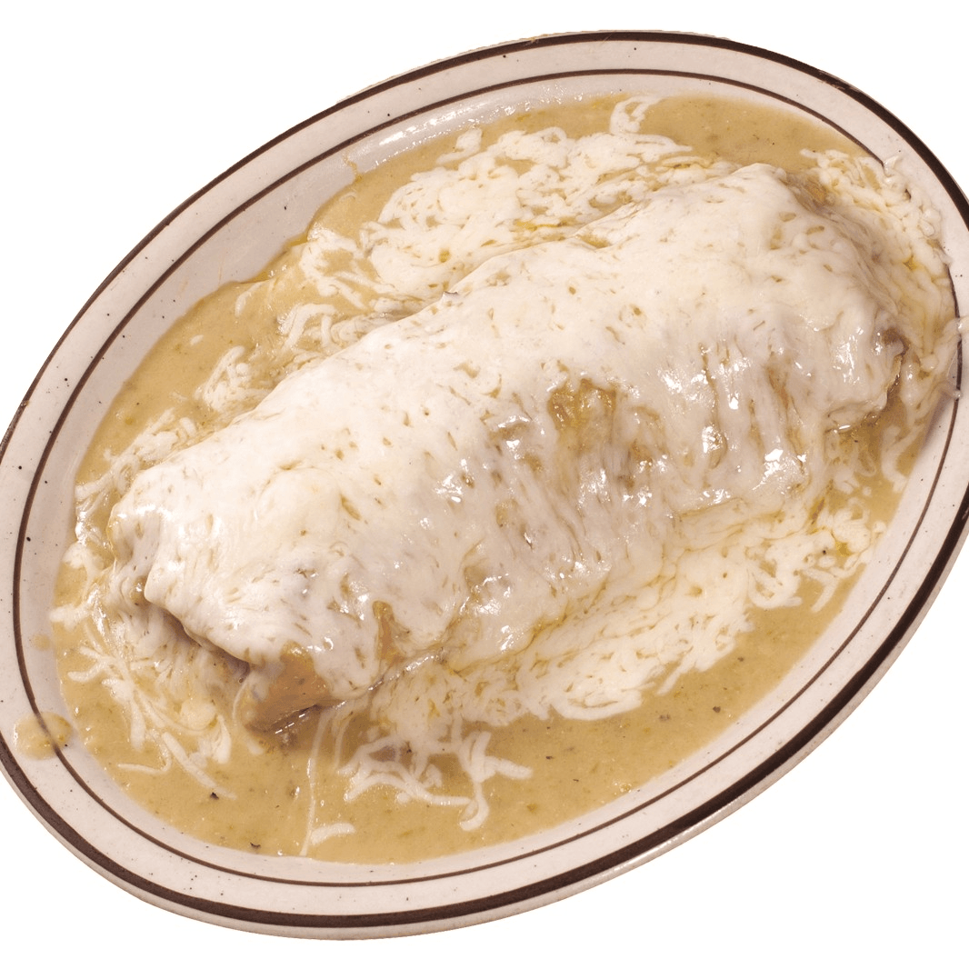 Large flour tortilla filled with your choice of meat, lettuce, tomatoes, and sour cream. Covered with green sauce and cheese