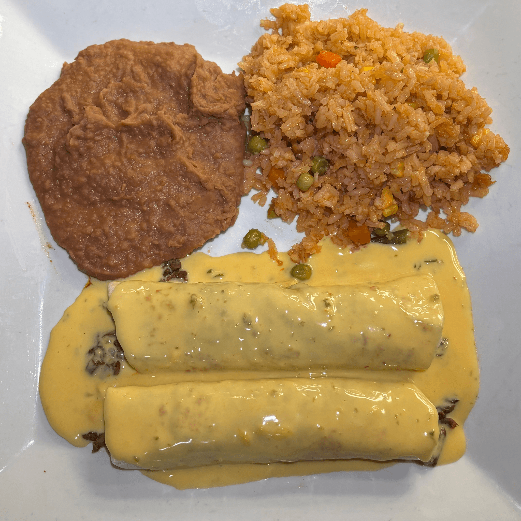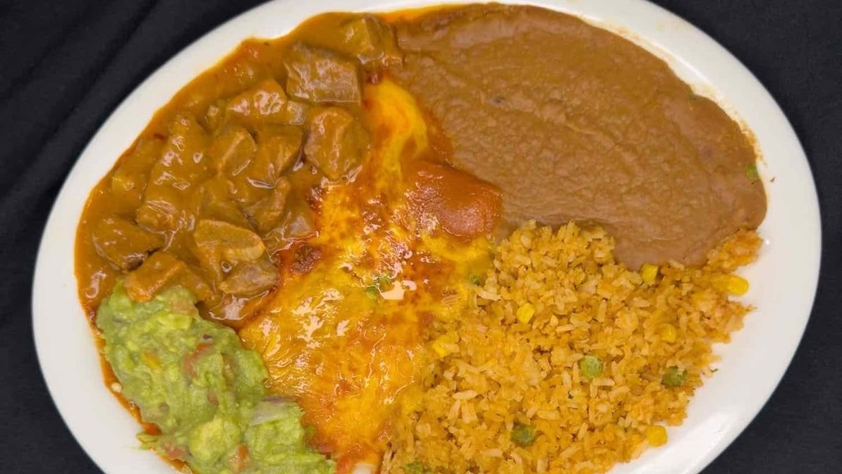 Three beef enchiladas covered with gravy and yellow cheese. Served with Spanish rice and refried beans