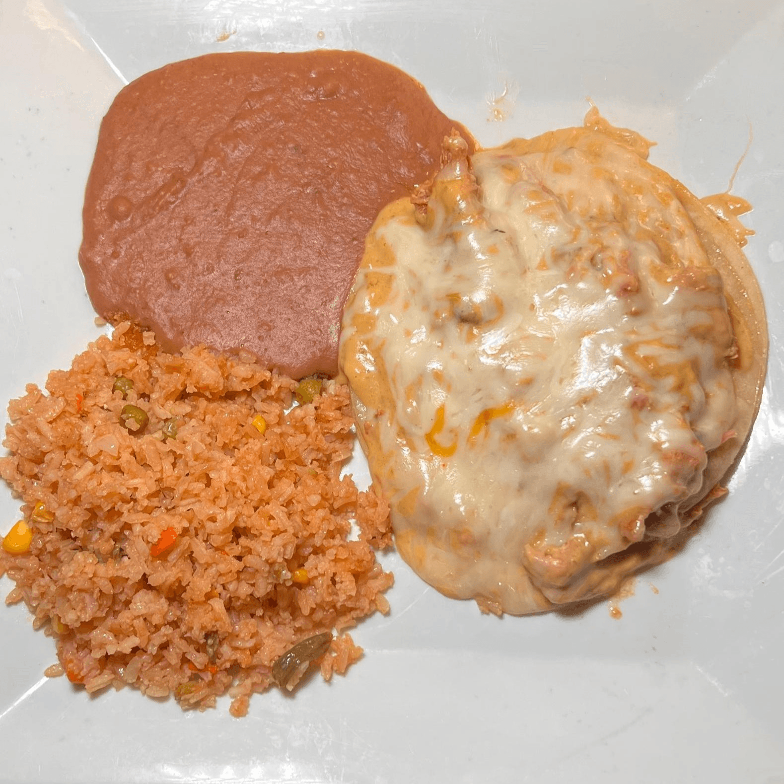 Served with Spanish rice and refried beans