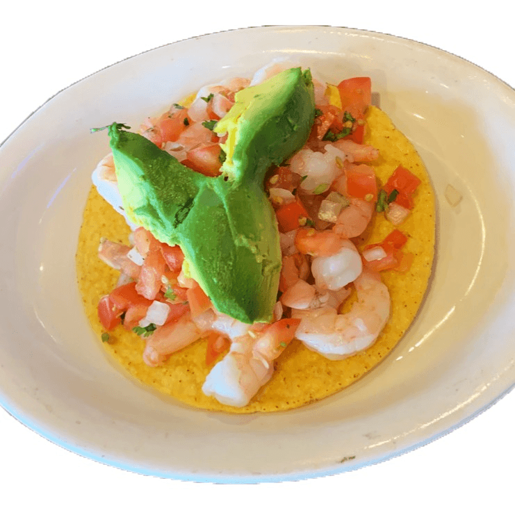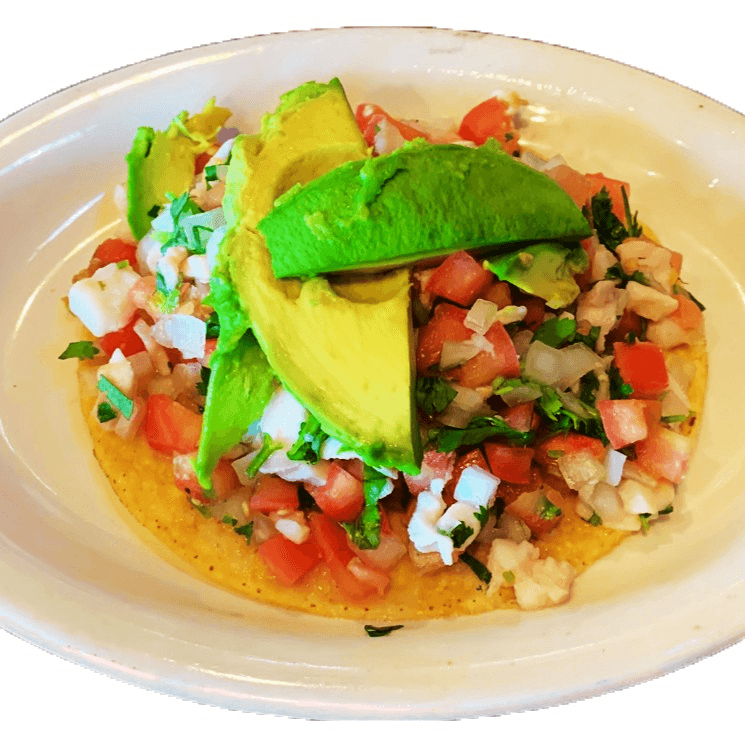 Crisp tortilla topped with marinated seafood, fresh avocado slices, crumbled cheese, shredded lettuce, diced tomatoes, and radish slices.
