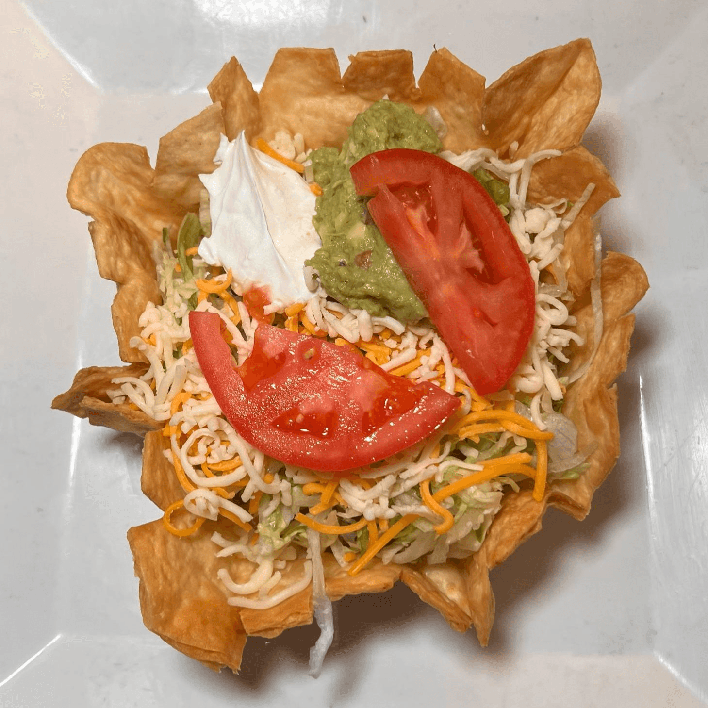 Crispy flour tortilla shell filled with refried beans, lettuce, sour cream, tomatoes, guacamole, cheese and your choice of ground beef or chicken