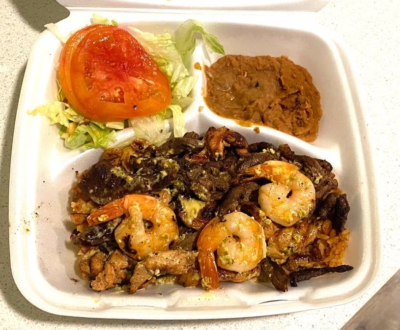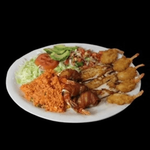 3 jumbo shrimp rolled in bacon, grilled tilapia, and 4 fried shrimp. Rice, salad and Pico de gallo