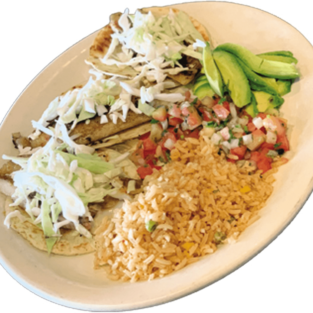 Fried Tilapia served with tortillas, rice, pico de gallo, salad, avocado and french fries