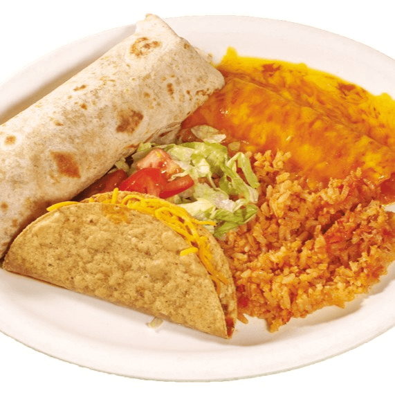 Crispy beef taco, enchiladas (choice of cheese, chicken, or beef), bean chalupa, and Spanish rice.