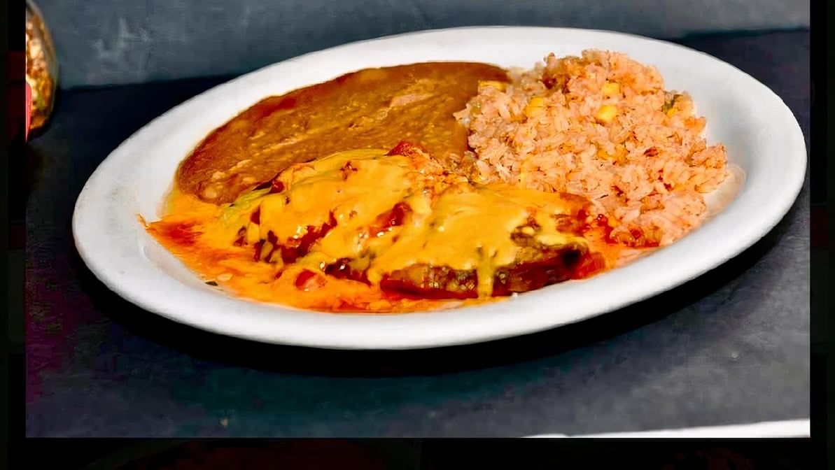 Ground beef or chicken covered with cheese. Served with Spanish rice, refried beans, salad, and sour cream