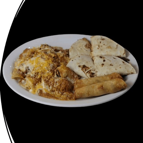 2 steak flour enchiladas topped with our special queso dip sauce. Served with rice and beans