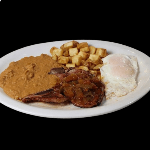 Delicious porchop comes with refried beans, potatoes, 2 eggs, and tortilla