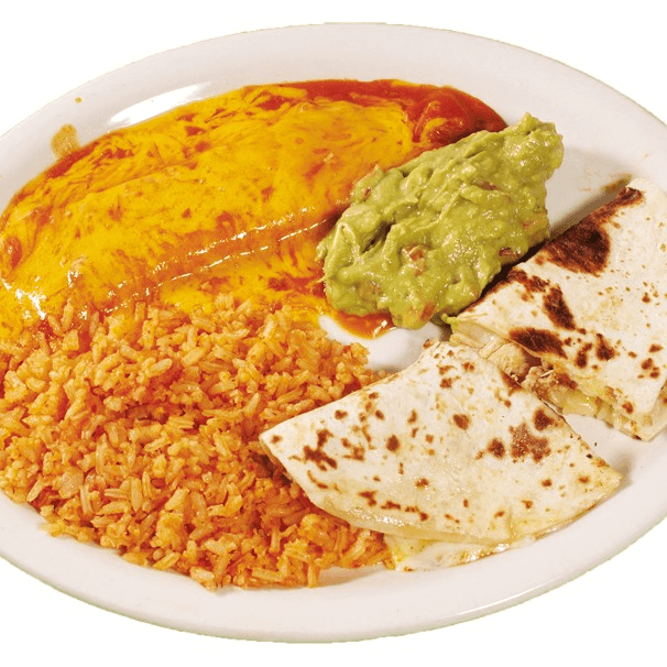 Chicken quesadilla paired with choice of cheese, chicken, or beef enchilada. Served with Spanish rice and guacamole.