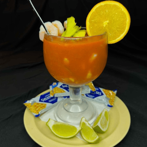 Plump shrimp in a tangy tomato-based sauce, garnished with fresh avocado, celery, and a slice of orange.