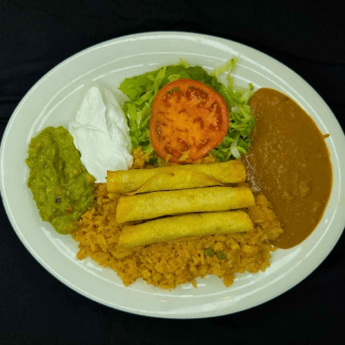 Three deep-fried corn tortillas stuffed with chicken. Served with Spanish rice, beans, guacamole, salad and sour cream