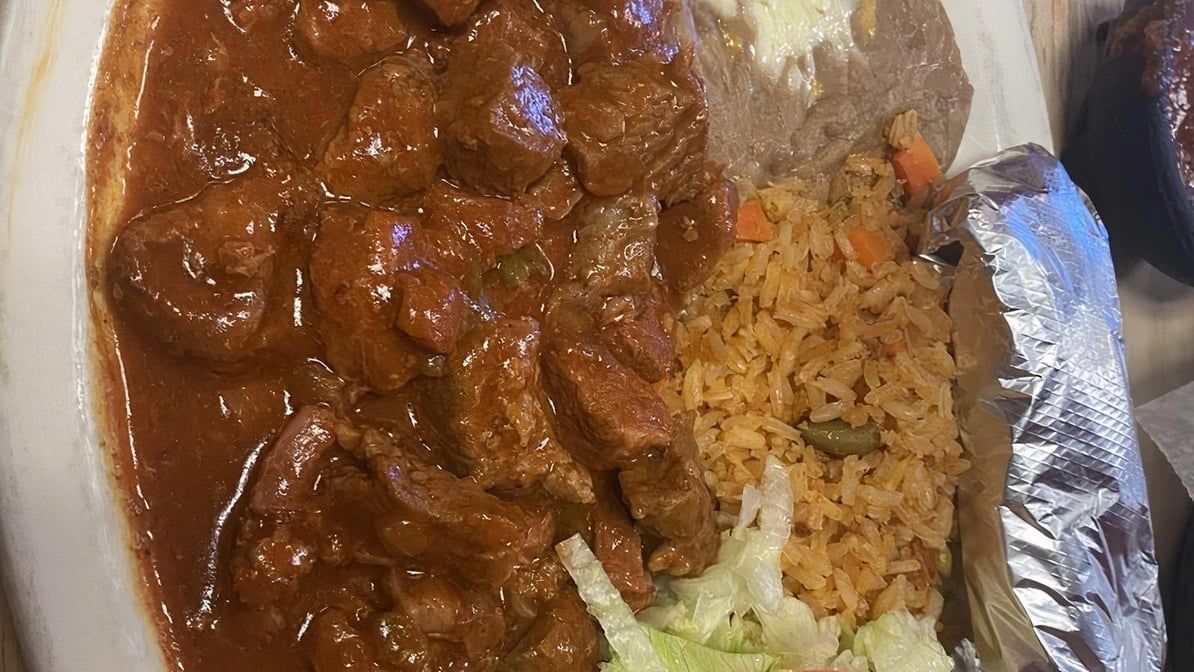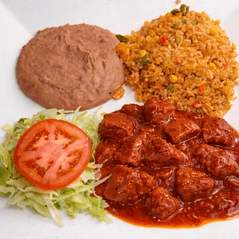 Small pieces of beef cooked with brown gravy. Served with Spanish rice, refried beans, salad, and tortillas