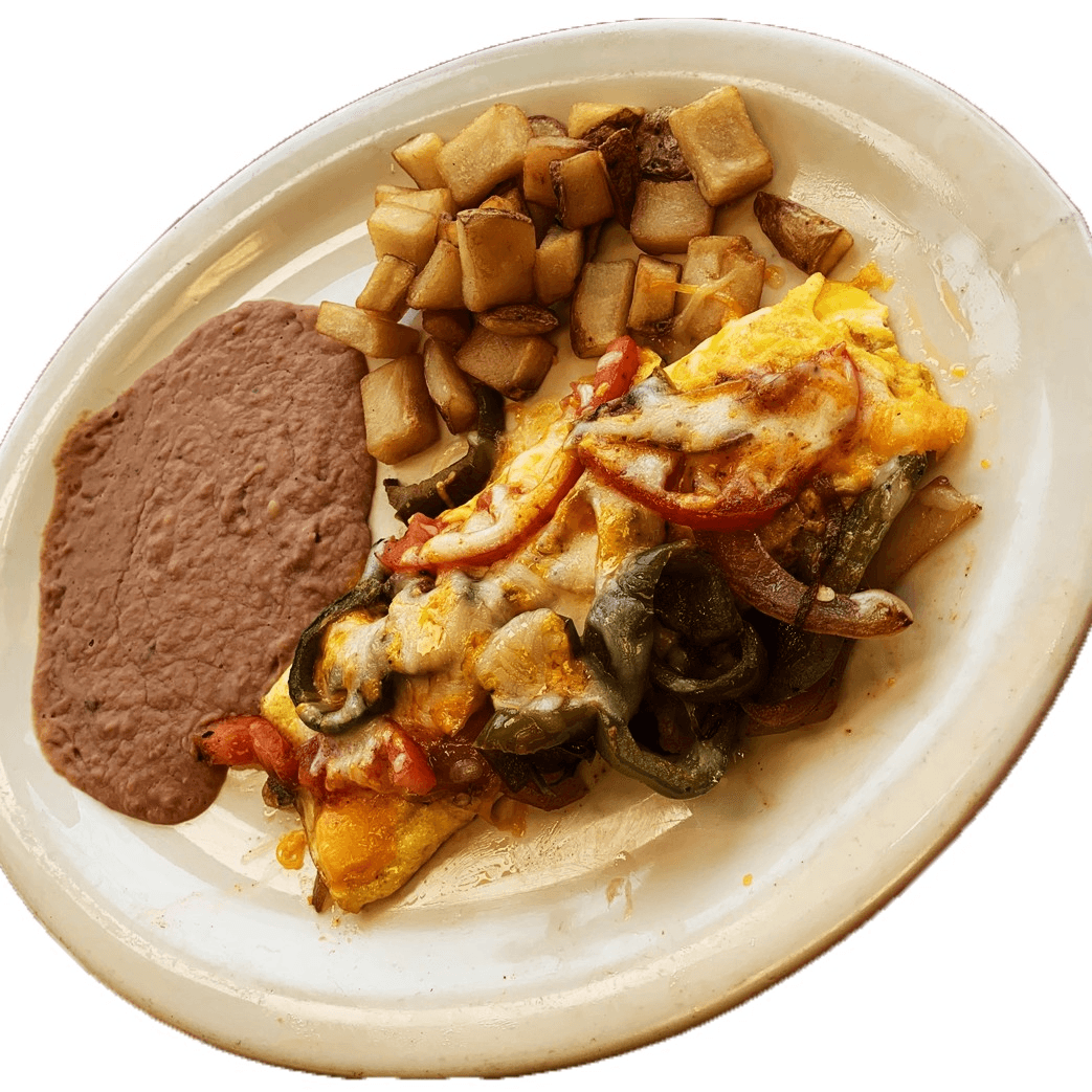 2 eggs scrambled, fried and folded stuffed with peppers, onions, tomatoes, and cheese. Served with refried beans, and potatoes