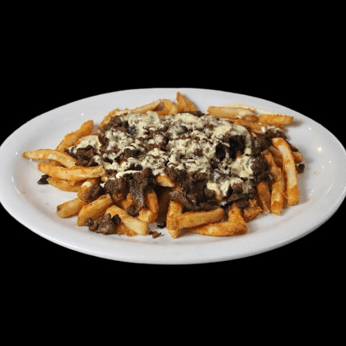 Bed of French Fries Topped with Steak and our house special queso dip