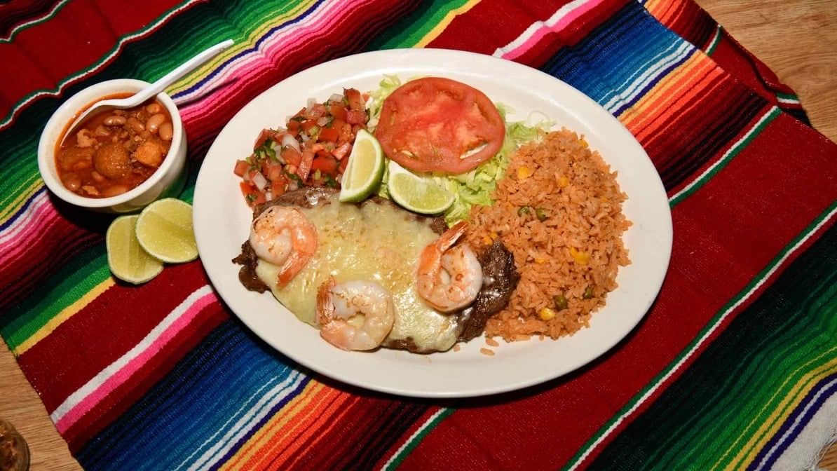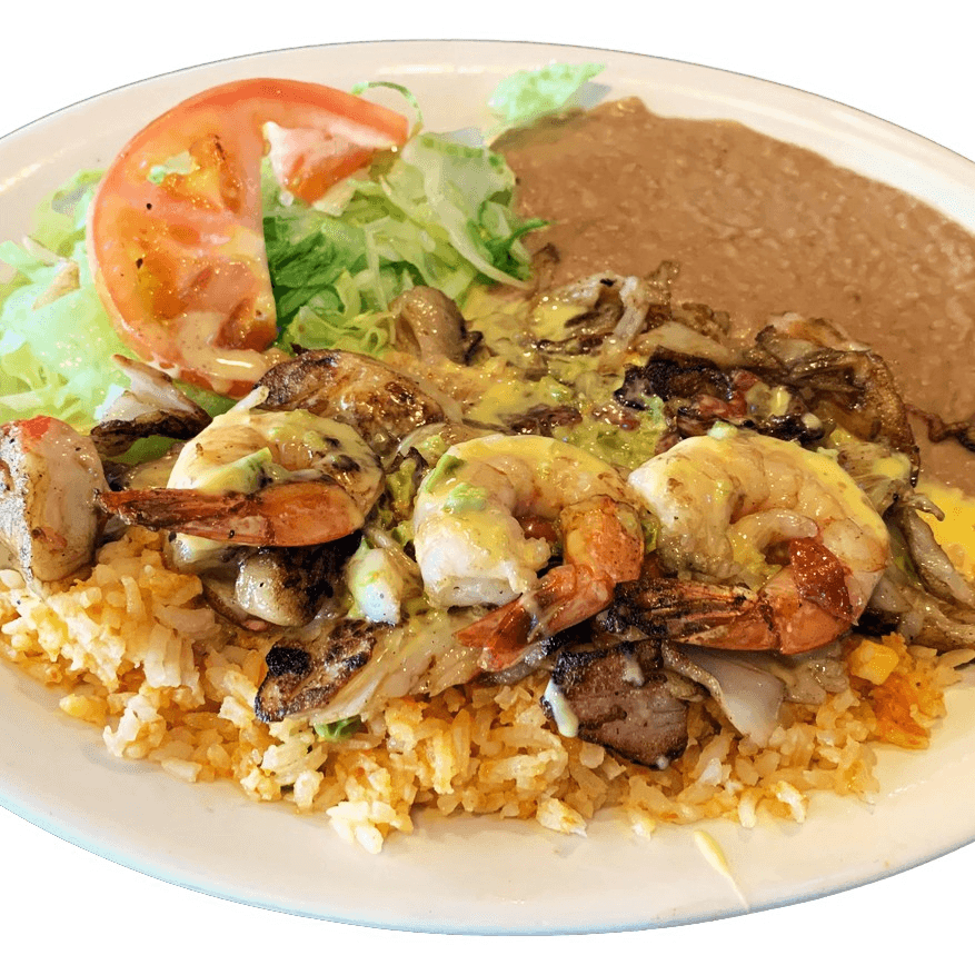 Our delicious ribeye steak topped with shrimp and melted white cheese. Served with charro beans, rice, salad, pico de gallo, and tortillas