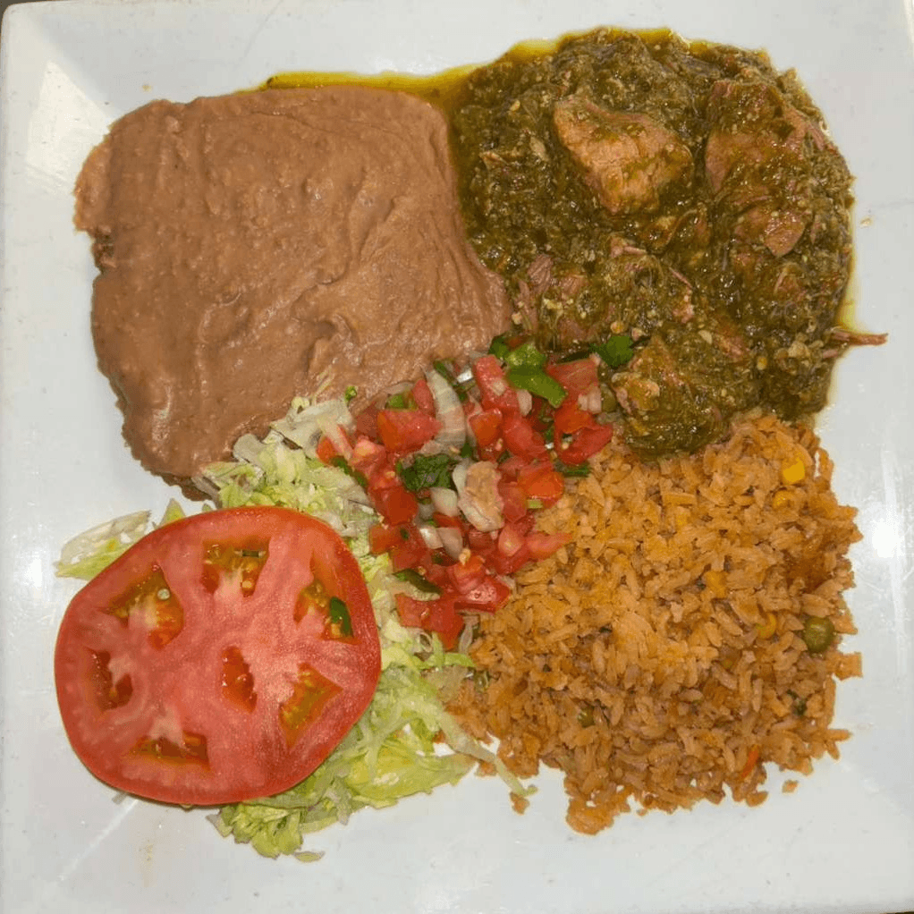 Pork chunks cooked to perfection with our green sauce. Served with tortillas, Spanish rice, refried beans, salad, and pico de gallo