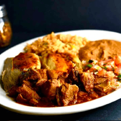 Pork chunks cooked to perfection with our red sauce. Served with tortillas, Spanish rice, refried beans, salad, and pico de gallo