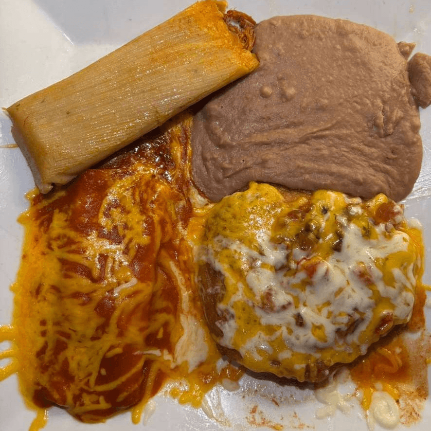 1 enchilada, 1 tamale, 1 chile relleno, and refried beans. Enchilada options include cheese, chicken, or beef.