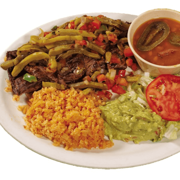 A tender strip sirloin grilled to perfection. Served with nopalitos, Spanish rice, salad, guacamole, charro beans and tortillas
