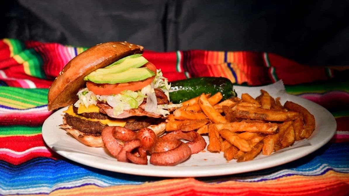 Grilled beef patty, bacon, ham, lettuce, tomato, and avocado. Comes with fries and a jalapeno