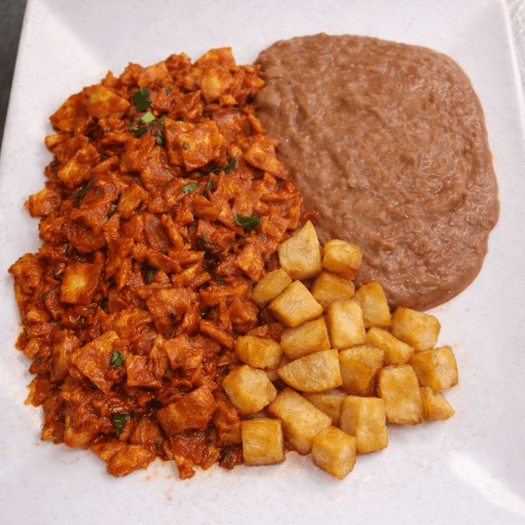 Diced corn tortillas with tomatoes, onions, red sauce and white cheese. Served with refried beans, potatoes, and tortillas